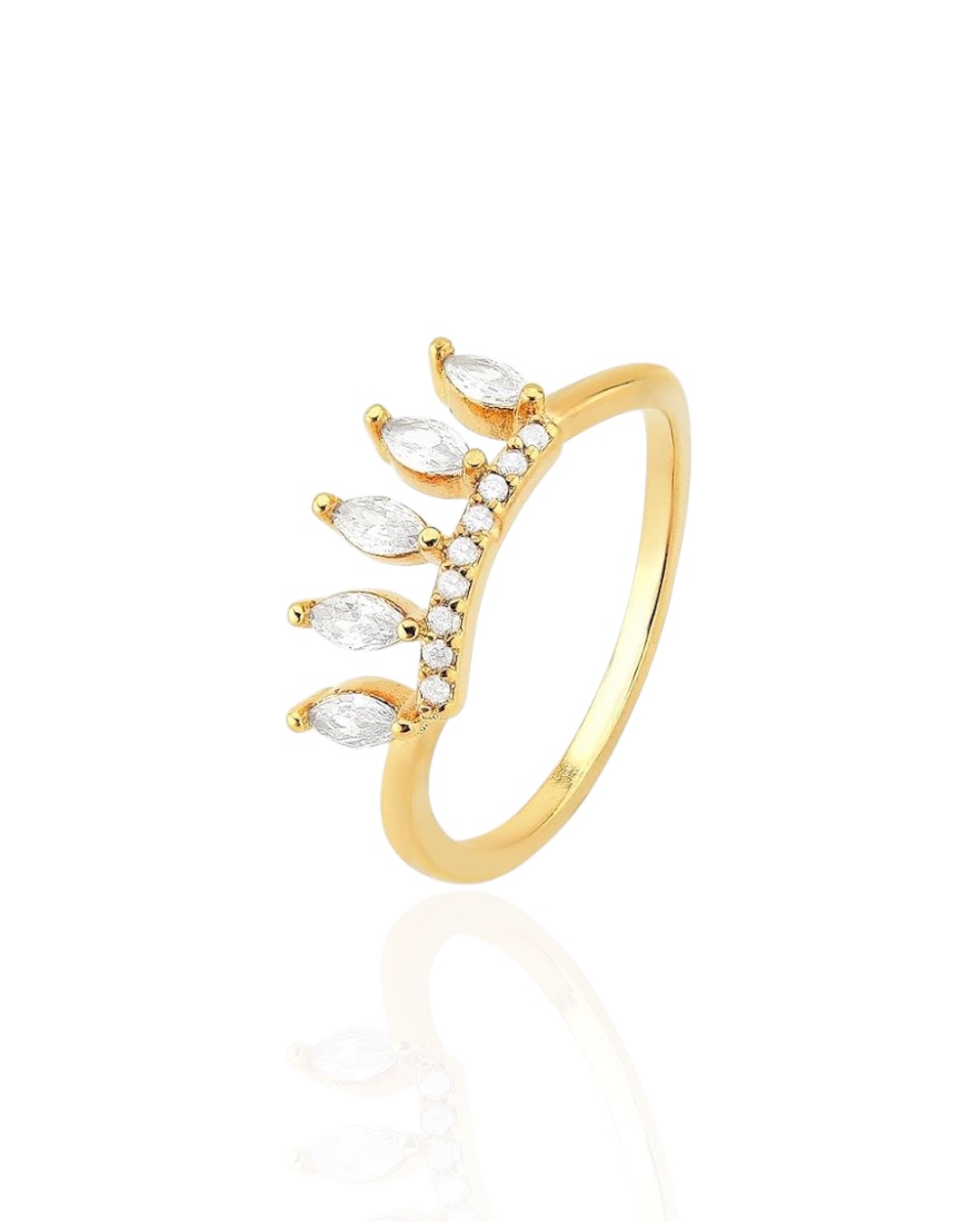 Anel Banhado a Ouro 18k Formato de Meia Coroa com Zircônias navete e cravejado.