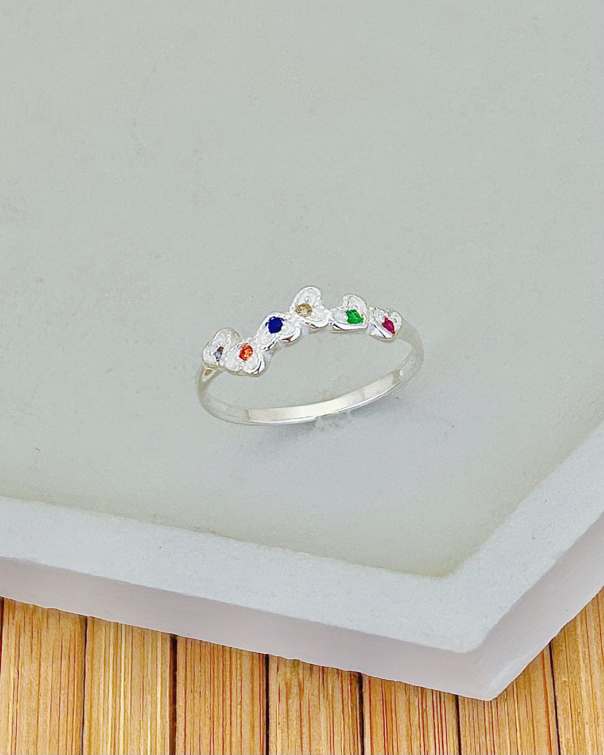 Anel em Prata 925 com 6 Corações Intercalados com 1 zircônia Colorida Cravejada no centro.