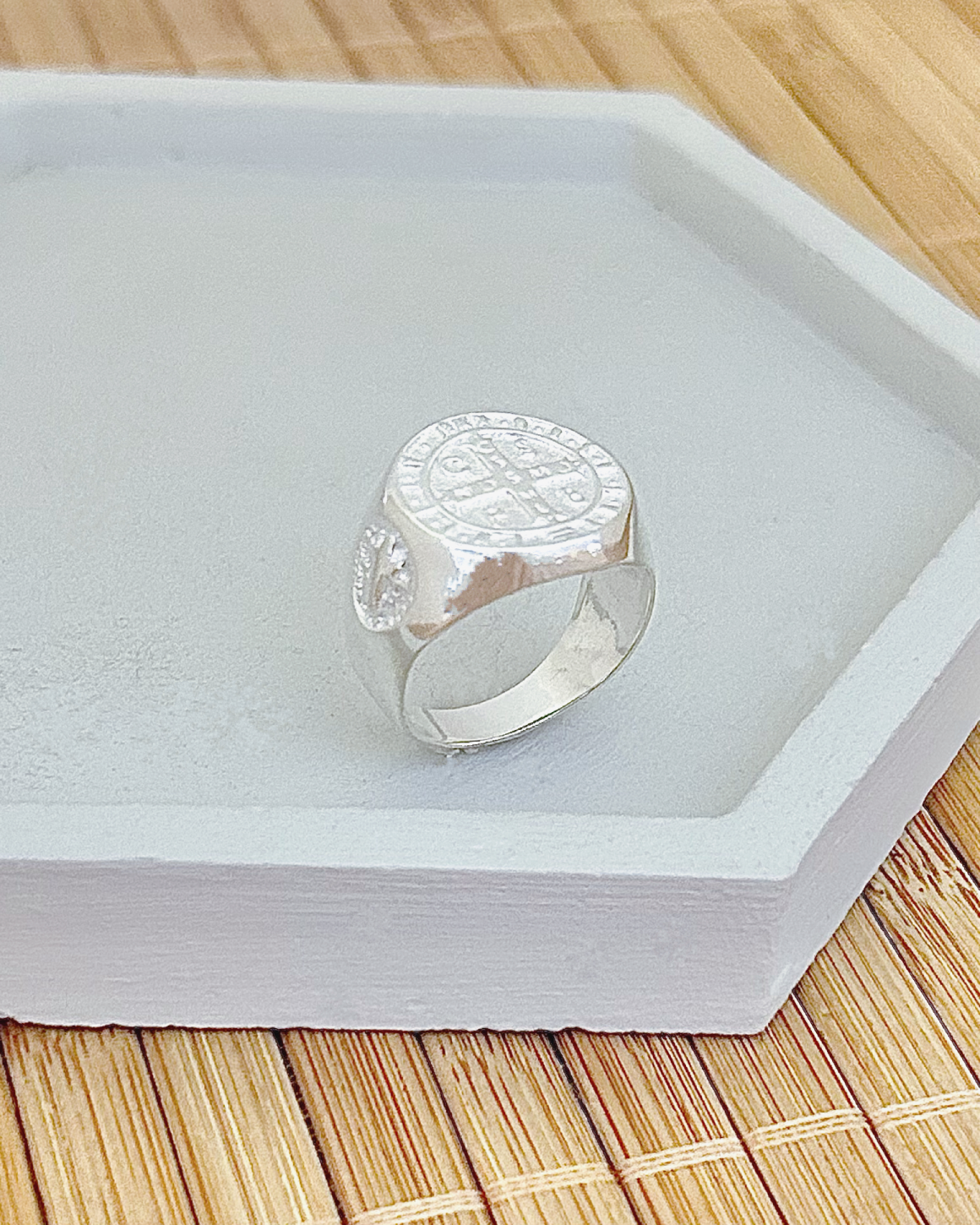 Anel em Prata 925 com Medalha de São Bento em alto relevo.