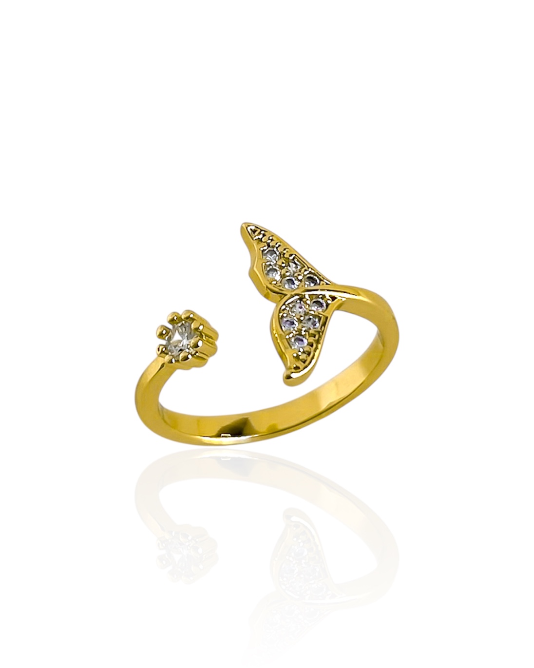 Anel com Banho de Ouro 18k Regulável com com Rabo de Sereia Cravejado e ponto de luz com zircônias cristal.