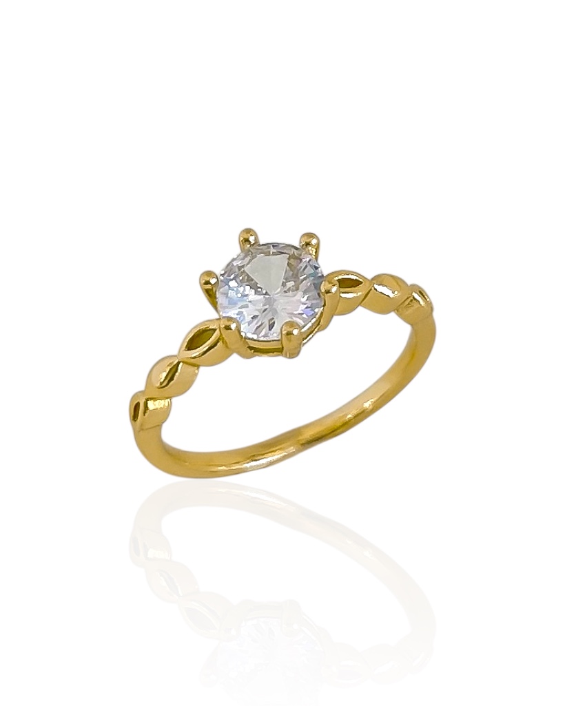 Anel Solitário com Zircônia Cristal e Gotas nas Laterais - Banho de Ouro 18k