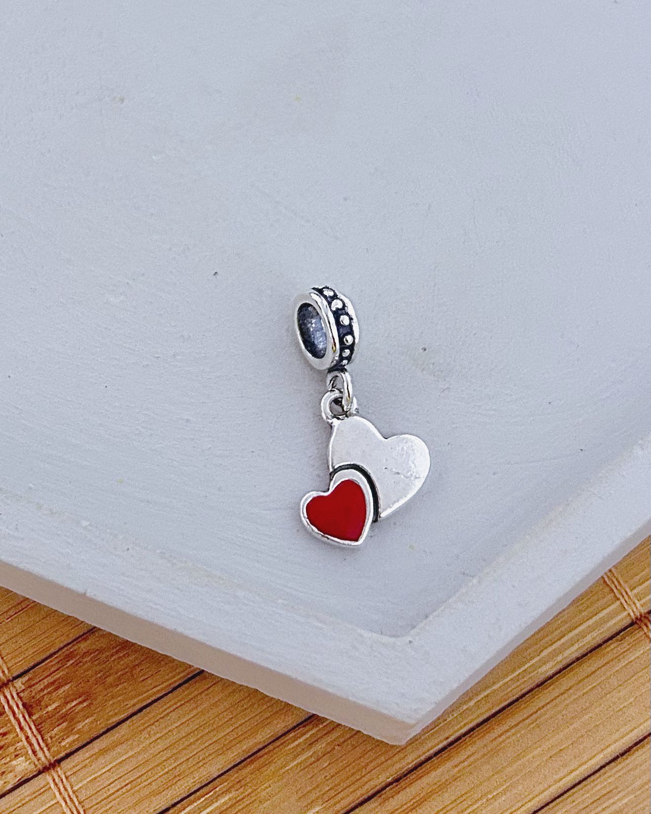 Berloque Dois Corações, um liso e resinado vermelho, pendurado. SEM PULSEIRA, apenas o berloque. Em Prata 925, compatível com todas as pulseiras!