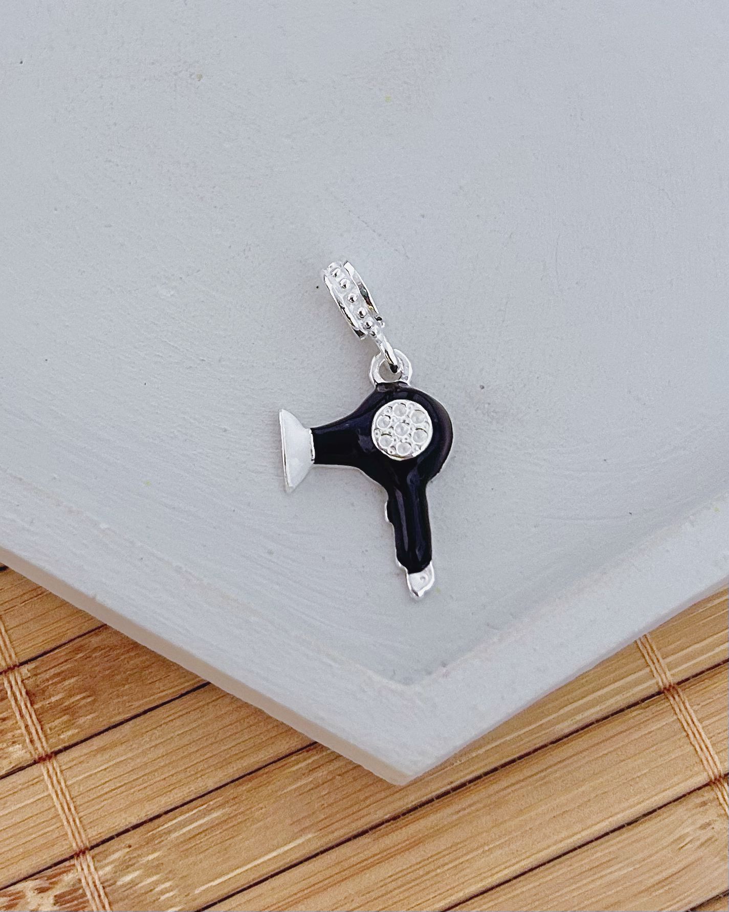 Berloque Secador de Cabelo cravejado de zircônias e Resina preta e Branca, Pendurado. SEM PULSEIRA, apenas o berloque. Em Prata 925, compatível com todas as pulseiras!