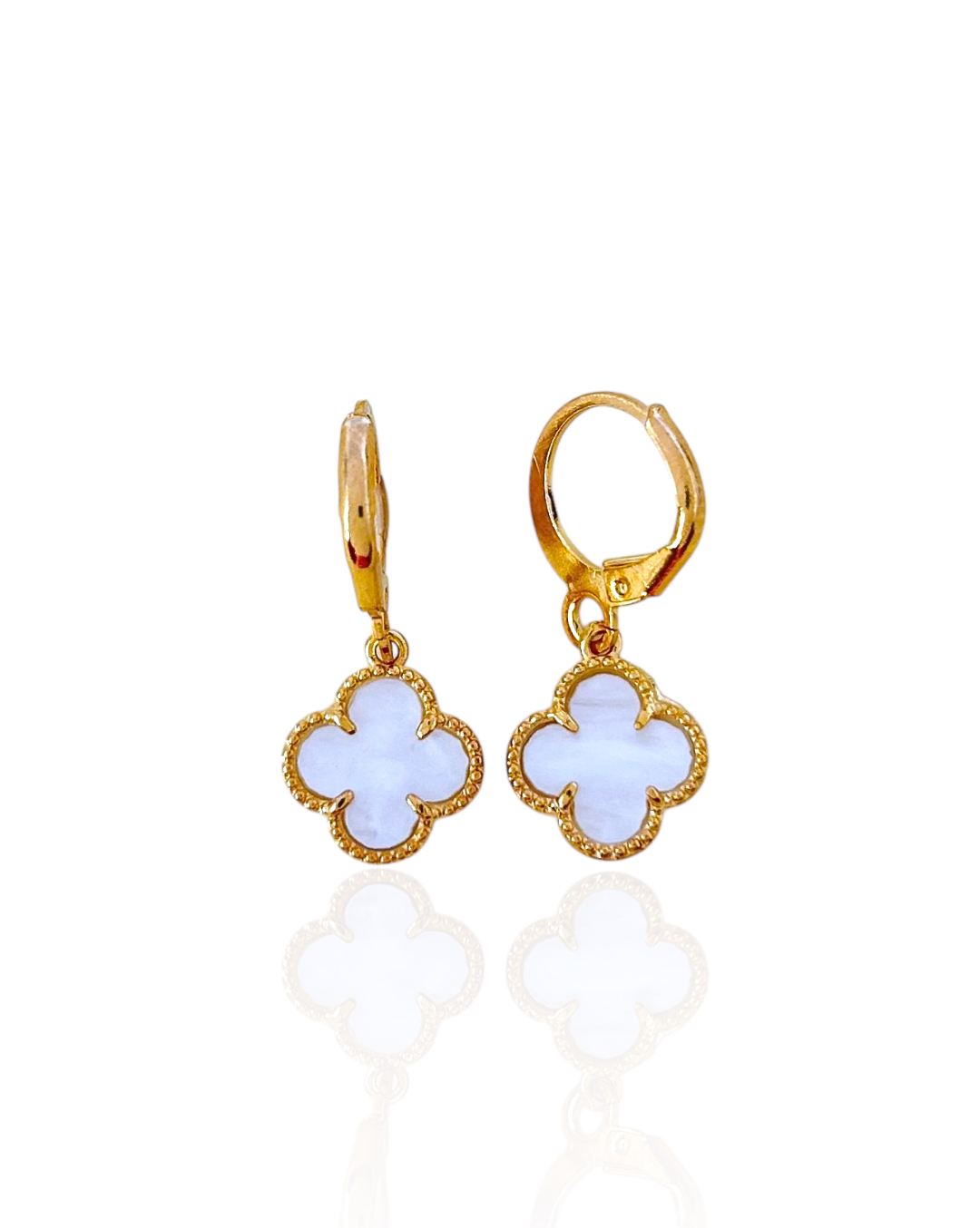 Brinco Argolinha Trevo Resina Branca Perolada - Banho Ouro 18k