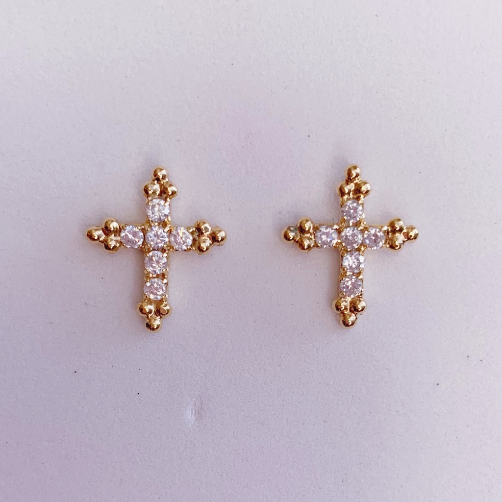 Brinco Cruz Cravejada c/ Bolinha 1,4cm x 1,2cm - Banho de Ouro 18k