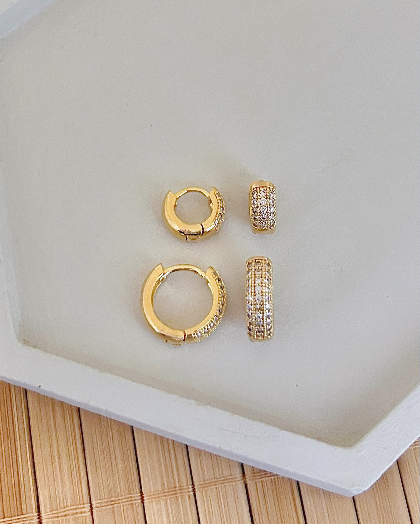 Duo de Brincos Banhado a Ouro 18k argolinha com 3 fileiras cravejadas de zircônia cristal, fechamento click!