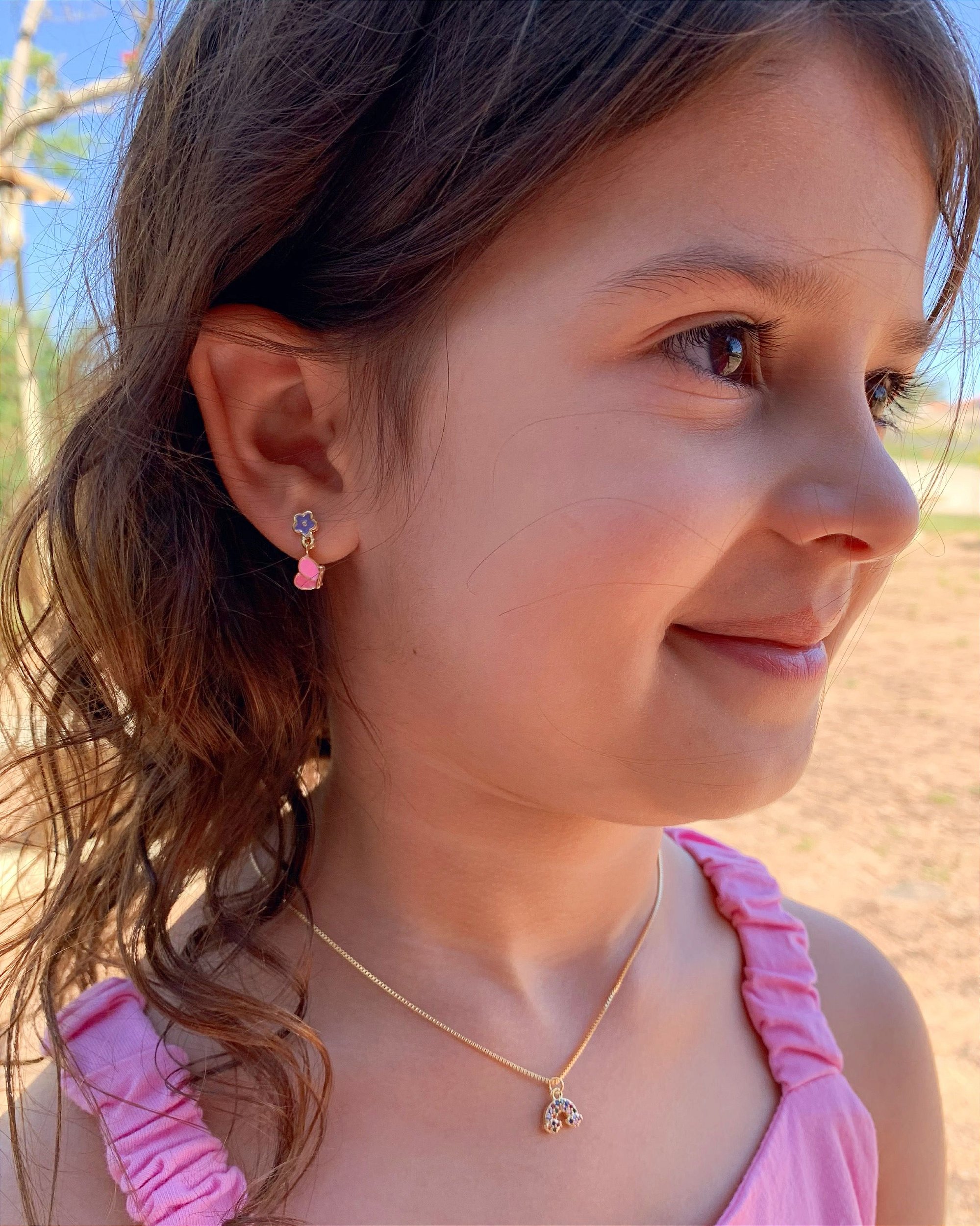 Brinco Infantil Florzinha + Borboleta Pendurada Resina Colorida - Banho de Ouro 18k