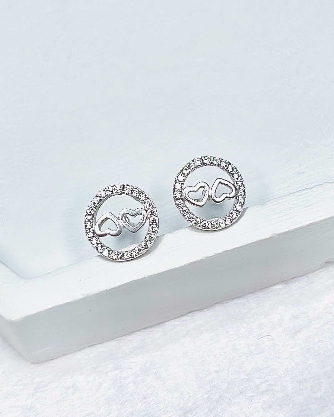 Brinco de Prata Circulo Cravejado c/ 2 Corações Vazados 1cm