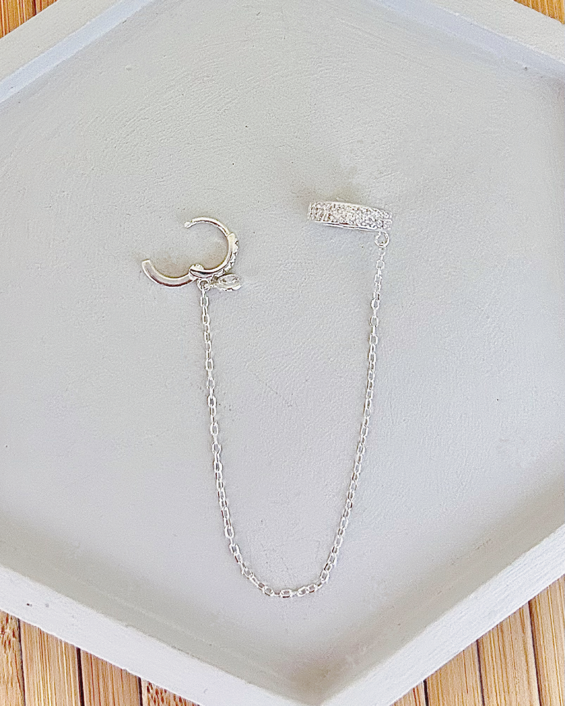 Brinco em Prata 925 Ear Line Argolinha Cravejada com Ponto de luz fechamneto click articulada, corrente elo Português com piercing fake com 2 fileiras cravejadas com zircônias cristal!