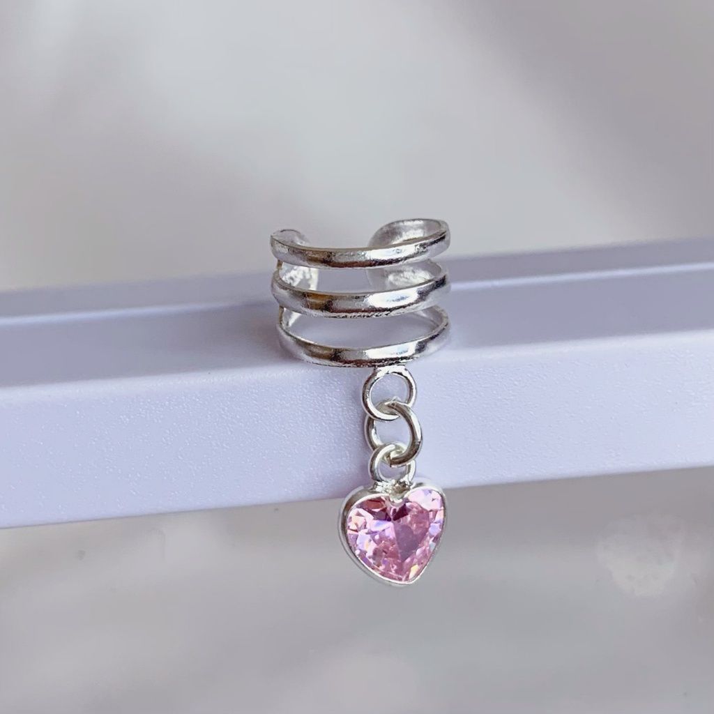 Brinco Piercing Fake c/ Pingente Coração Rosa UNIDADE - Prata 925