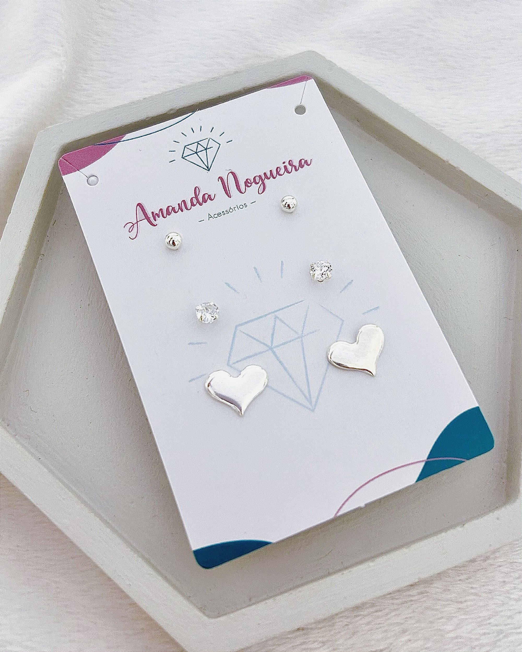 Brinco de Prata Trio Bolinha, Ponto de Luz e Coração