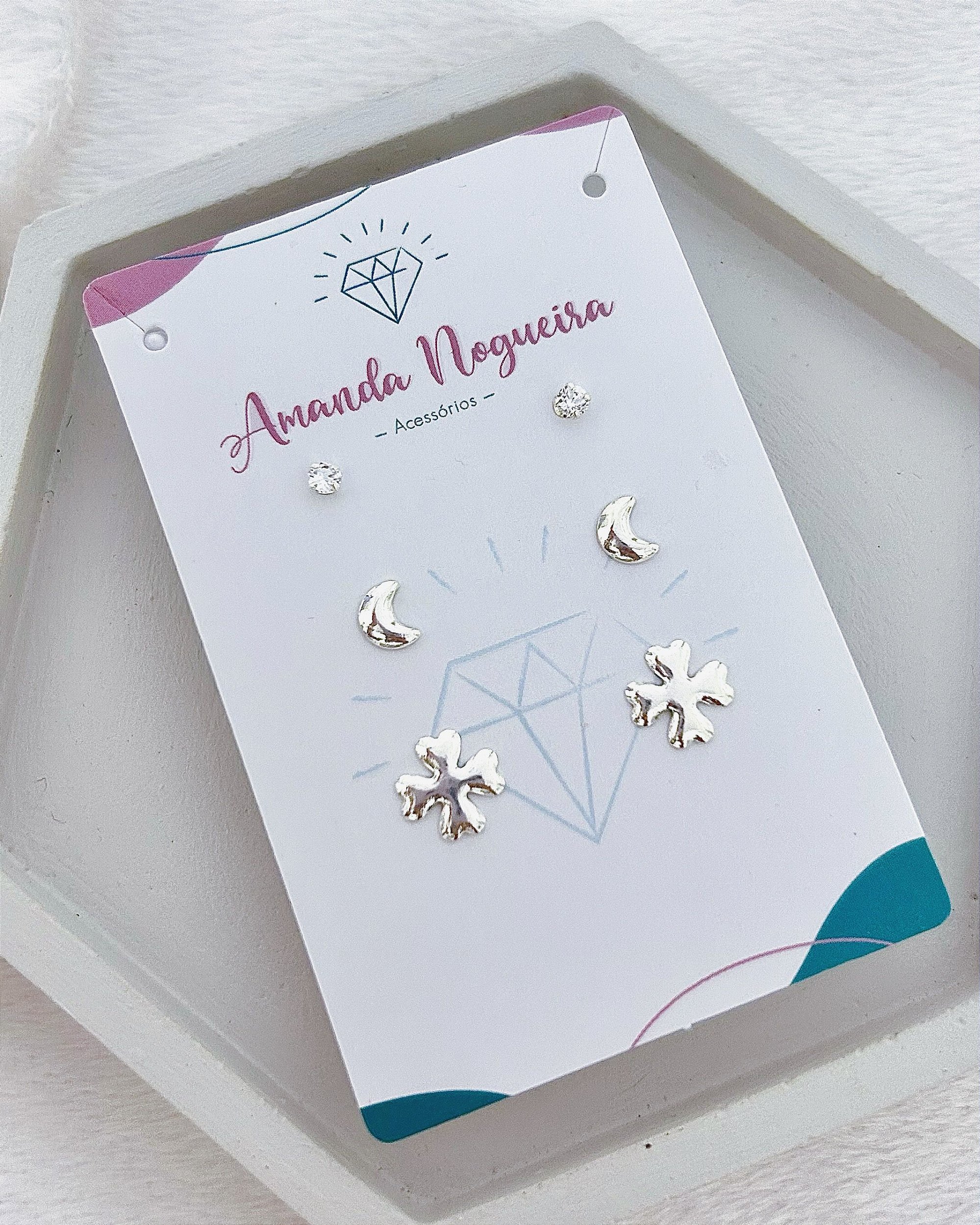 Brinco de Prata Trio Lua, Ponto de Luz e Trevo