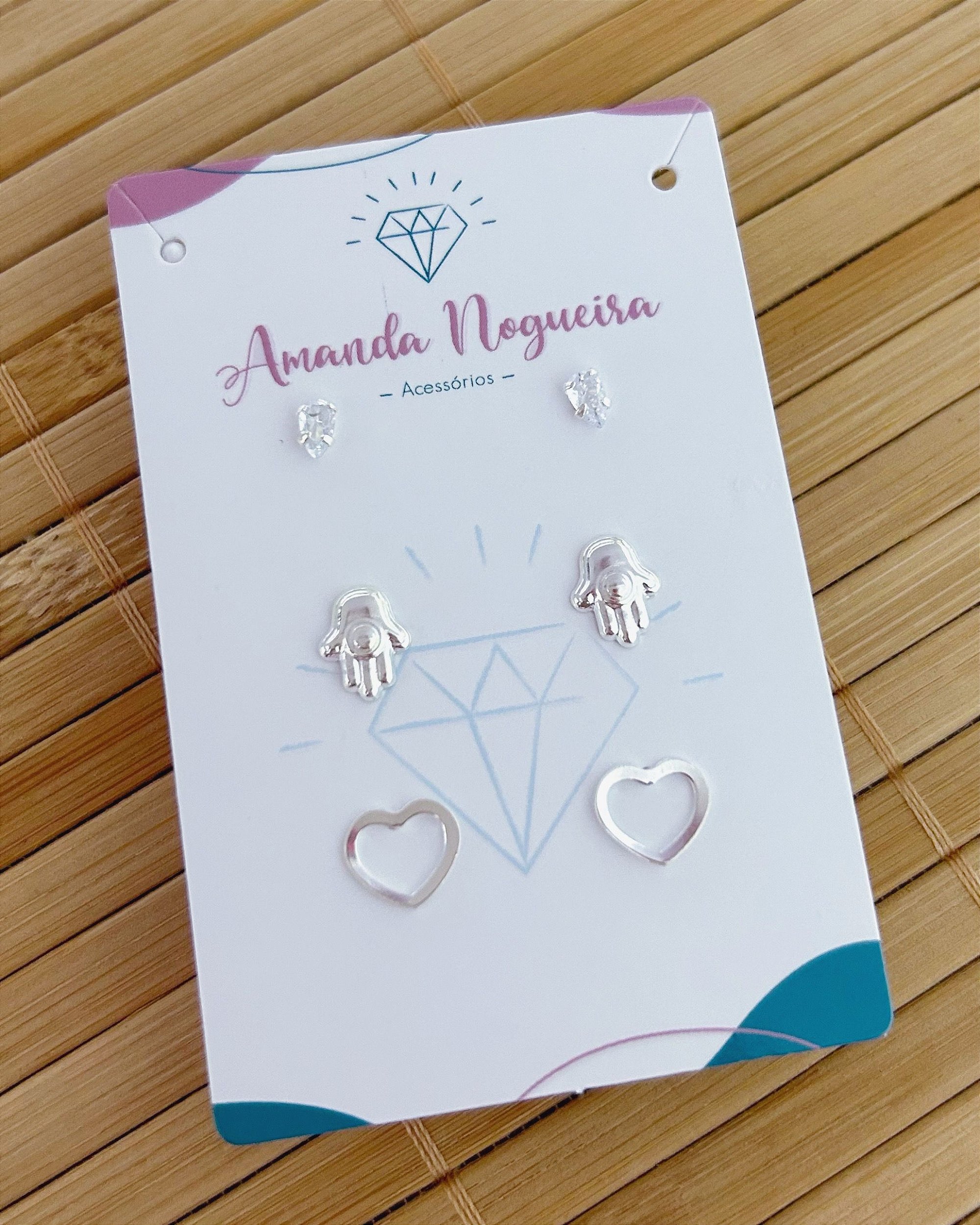 Brinco Trio Ponto de Luz Gota, Mão de Fatima e Coração Vazado - Prata 925