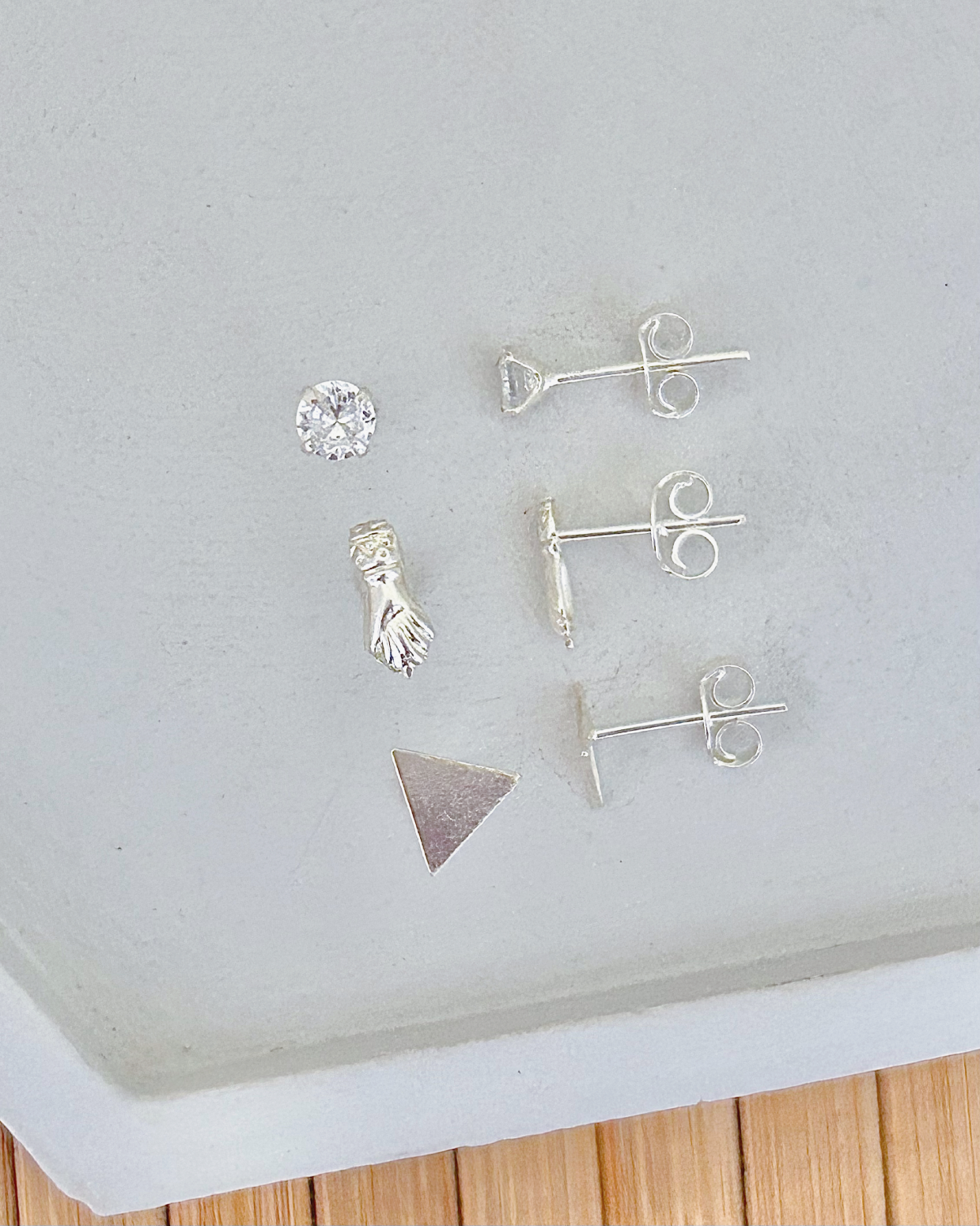 Trio de Brinco em Prata 925, Triângulo Liso, Ponto de luz de zircônia Cristal e Figa!