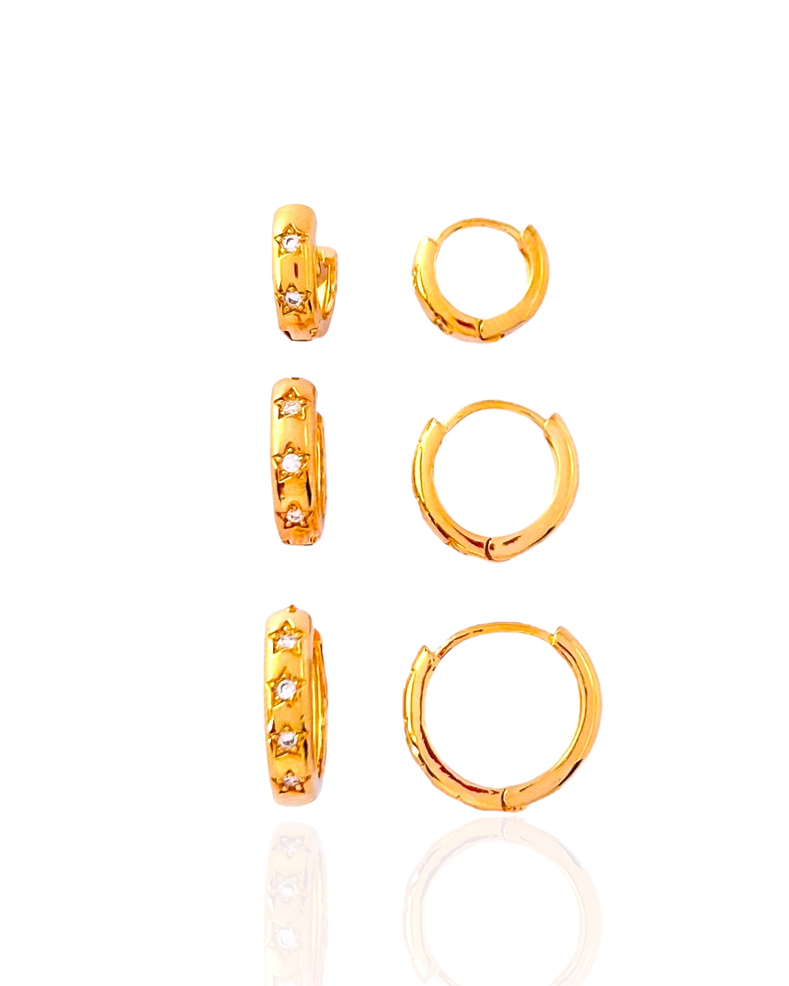 Brinco Trio de Argolinha Click c/ Estrela Micro zircônias Cristal Banho de Ouro 18k