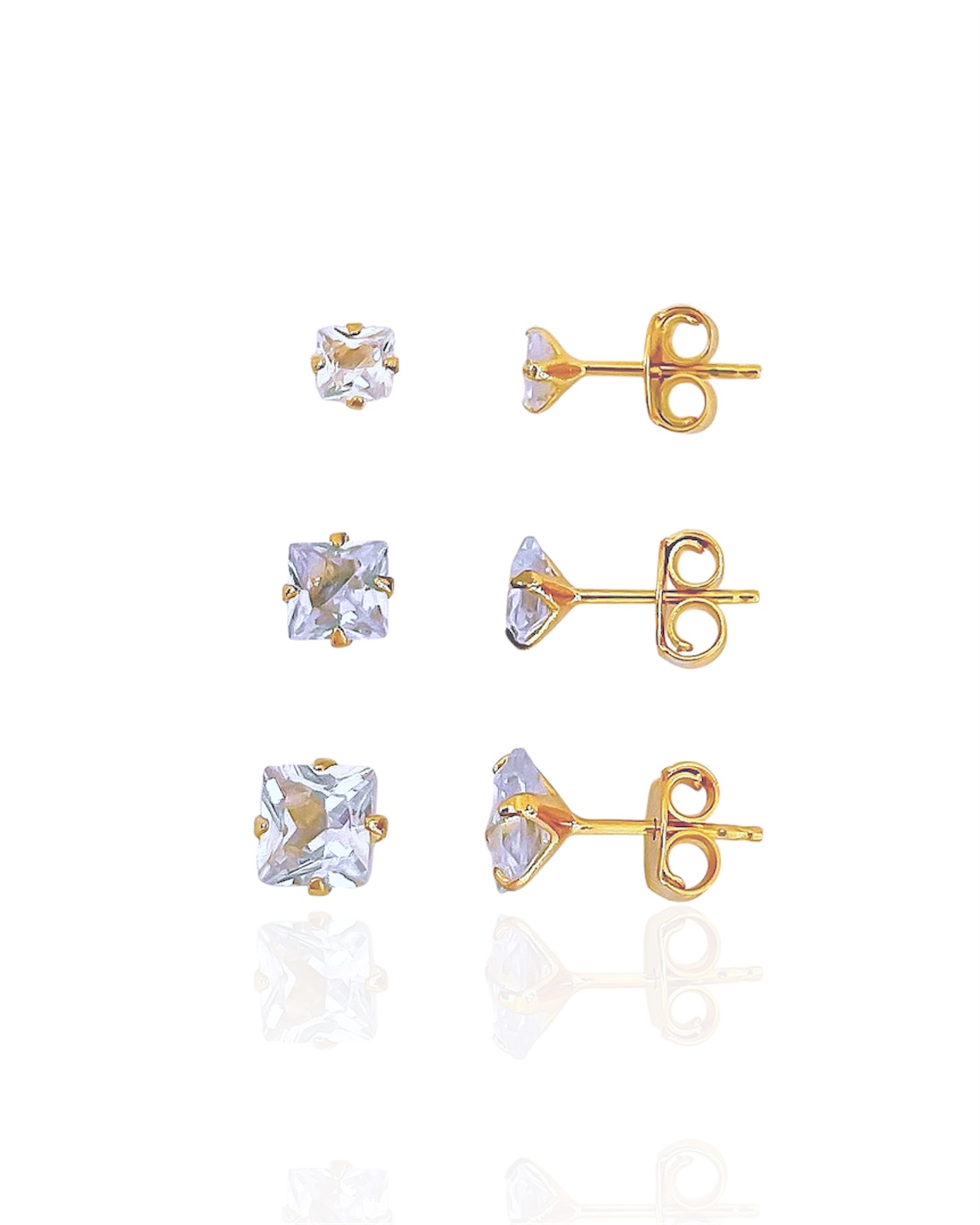 Trio de Brincos Banhado a Ouro 18k Ponto de luz Zircônia Quadrada com tarraxa!
