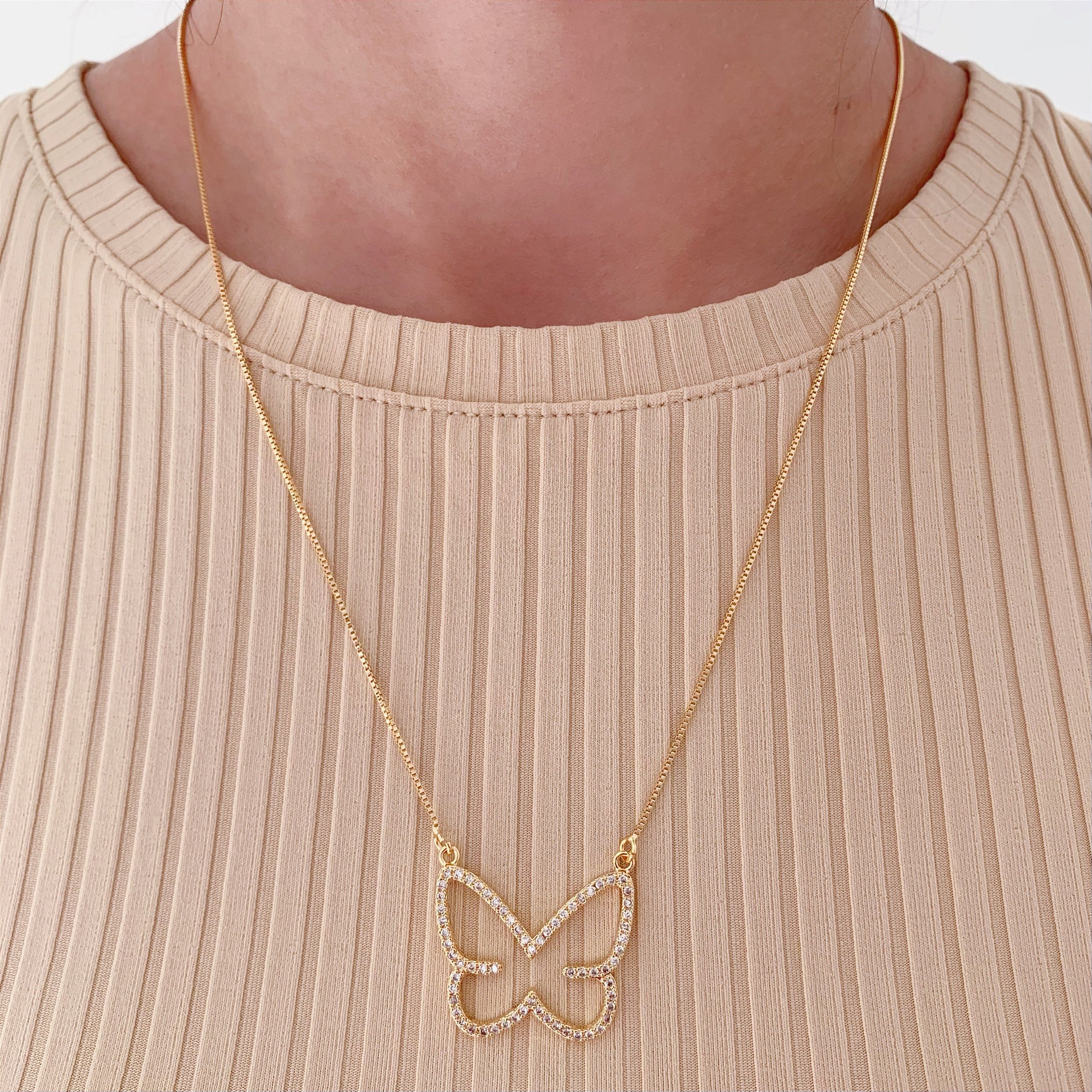 Colar Banhado a Ouro Borboleta Vazada Cravejada 45cm
