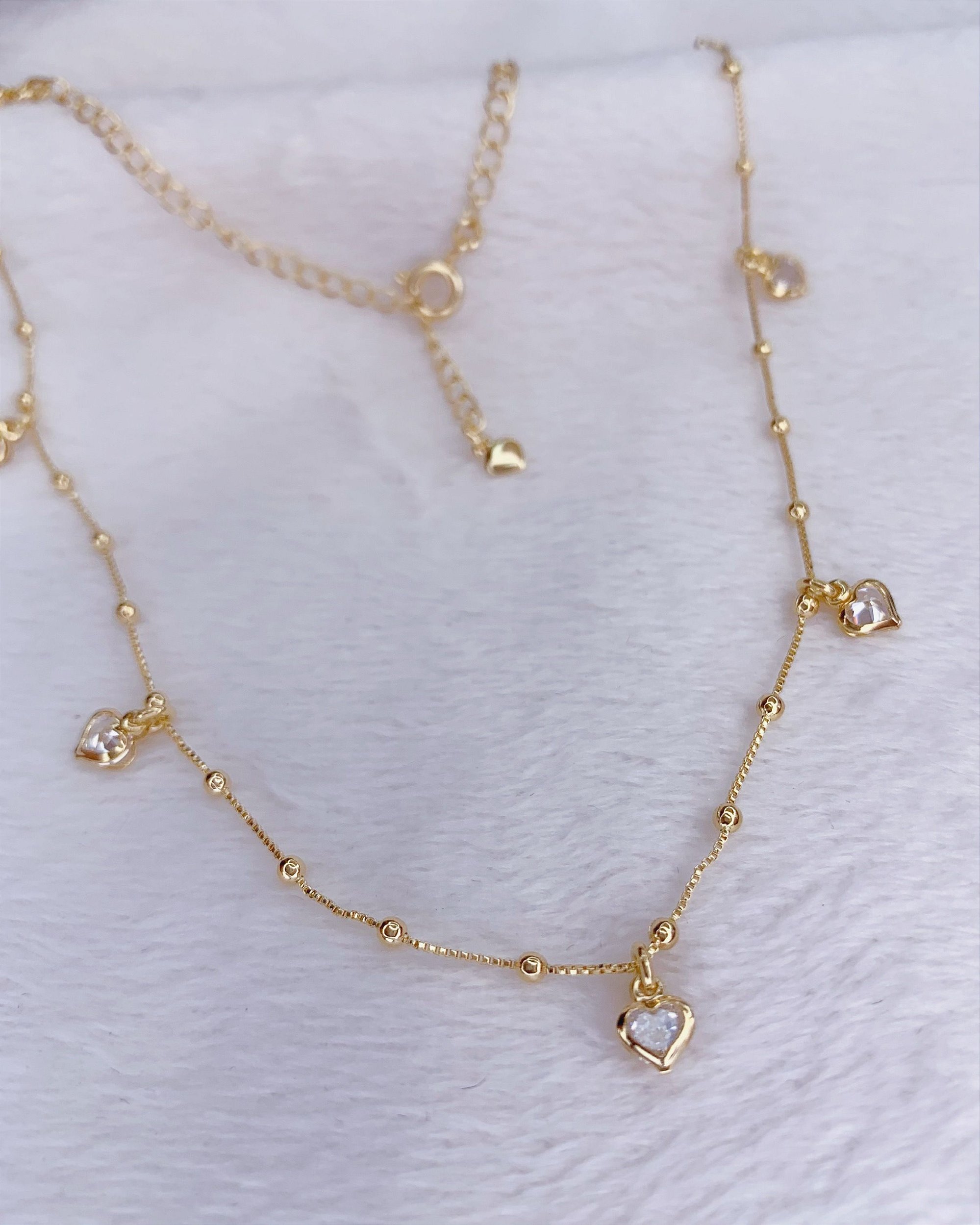 Colar Chocker Bolinha 1x1 c/ 5 Corações Zirconia 40cm - Banho de Ouro 18k