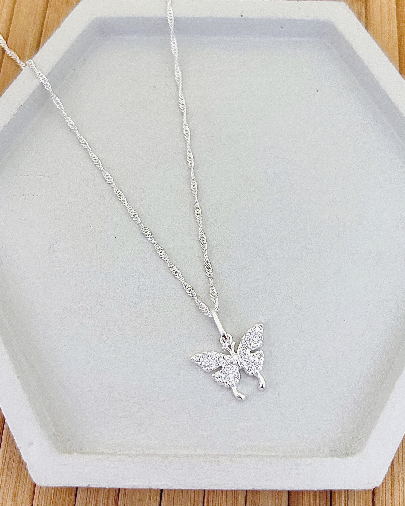 Colar em Prata 925 Corrente Singapura com Pingente de Borboleta Cravejada com Zircônias Cristal.