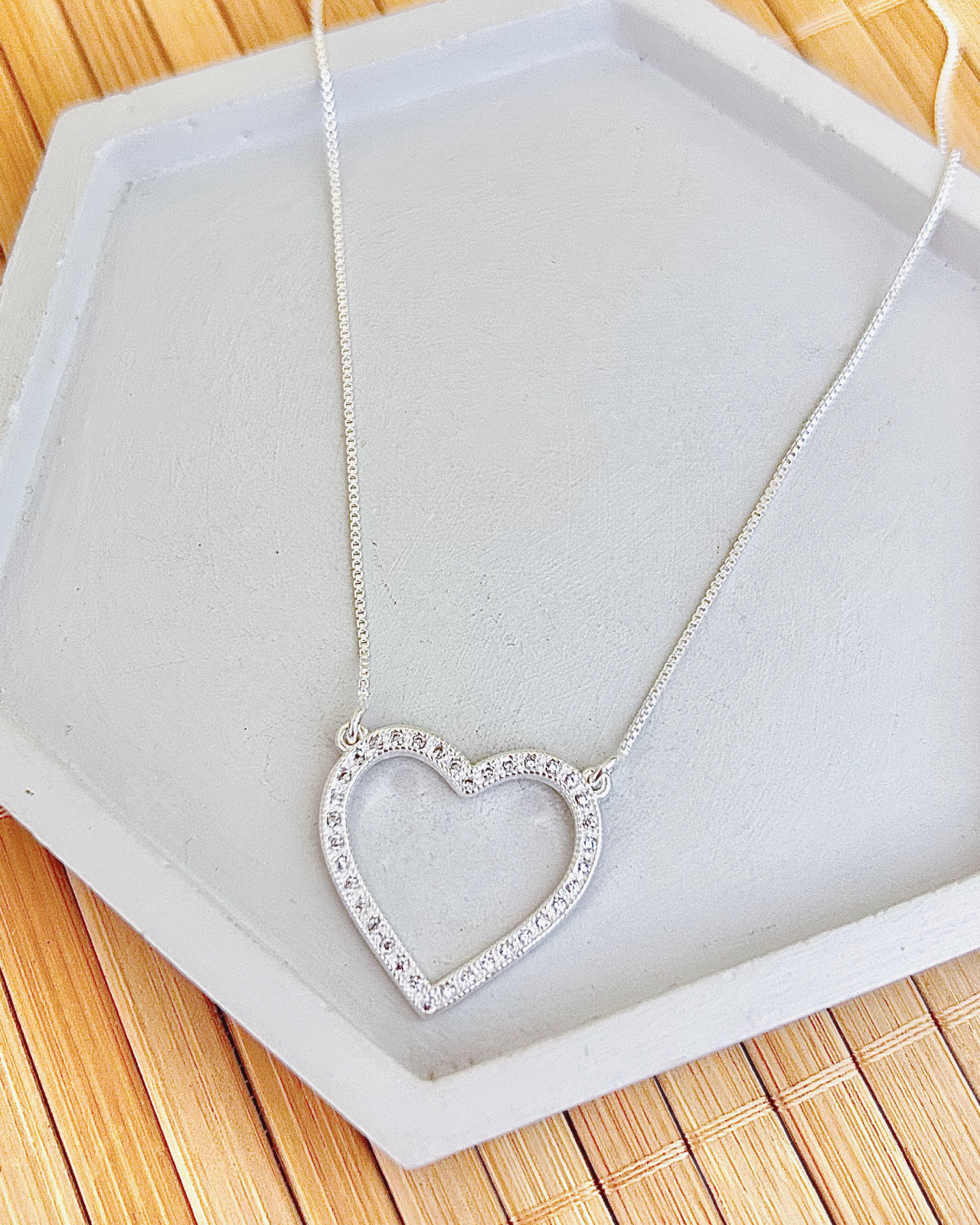 Colar em Prata 925 Corrente Veneziana com Pingente de coração Vazado Borda Cravejada com Zircônias Cristal.