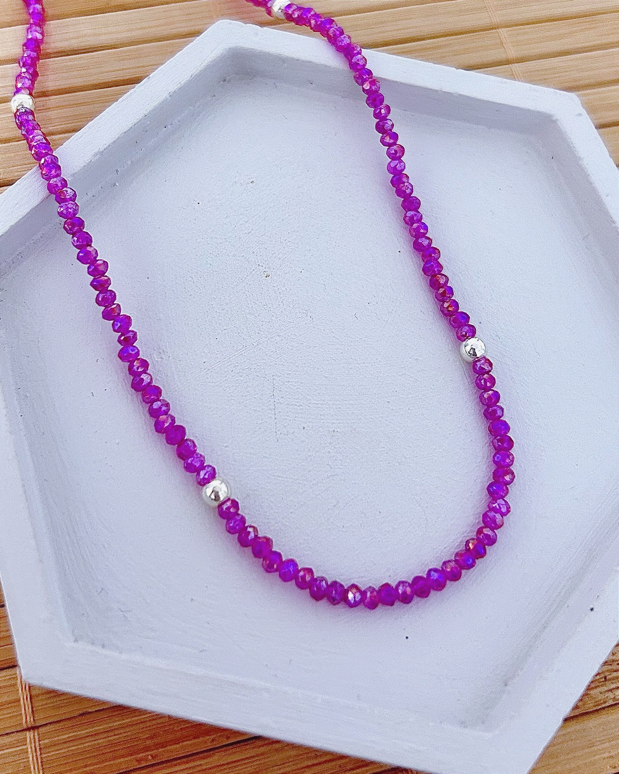 Colar de Prata Cristal Pink c/ Bolinhas 38cm + extensor de 7cm