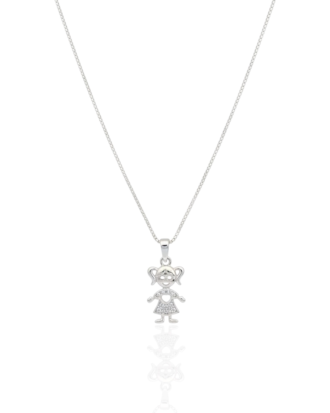 Colar em Prata 925 Corrente Veneziana com Pingente de Menina com Coração Vazado e vestido Cravejado com Zircônias Cristal.