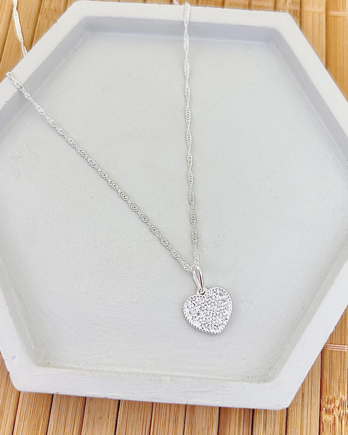Colar em Prata 925 Corrente Singapura com Pingente Plaquinha de Coração Cravejada com Zircônias Cristal.