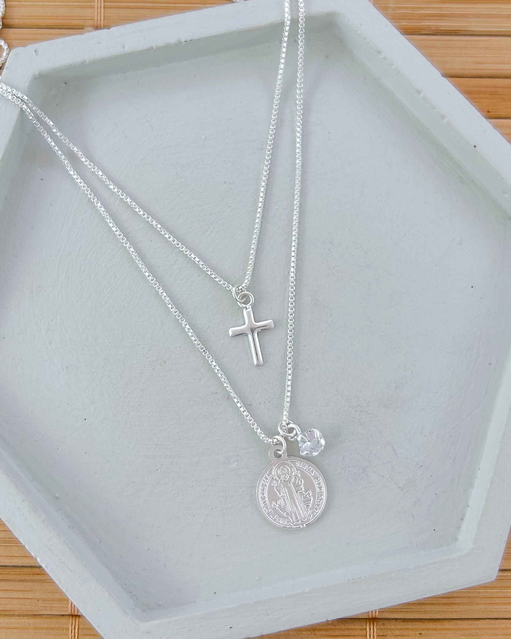 Colar em Prata 925 Corrente Veneziana com Pingente de Cruz no Colar Menor e Pingente Medalha de São Bento e Ponto de Luz no Colar Maior.