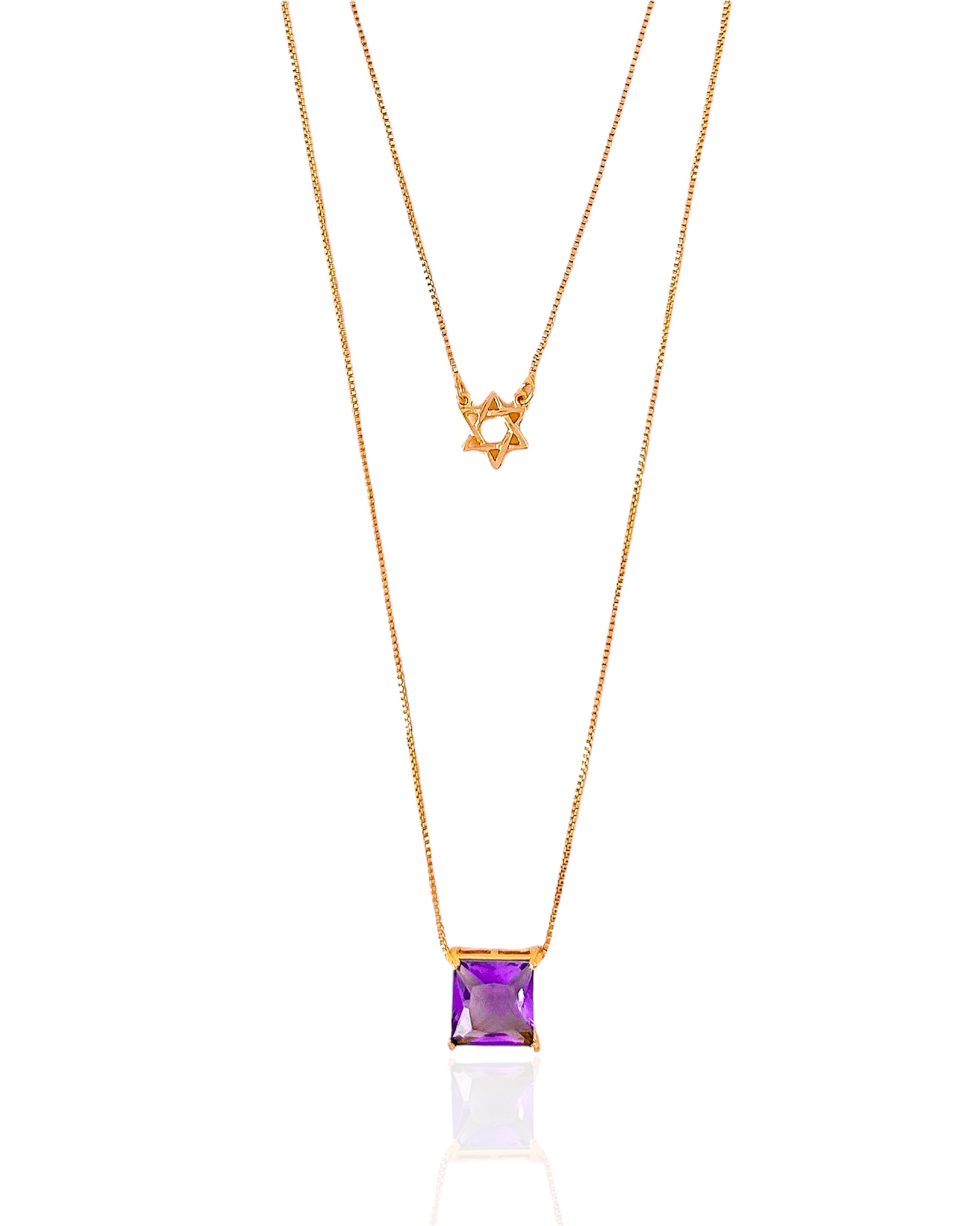 Colar Duplo Estrela de Davi e Zircônia Quadrada Veneziana 50cm + 5cm de Extensor - Banho de Ouro 18k