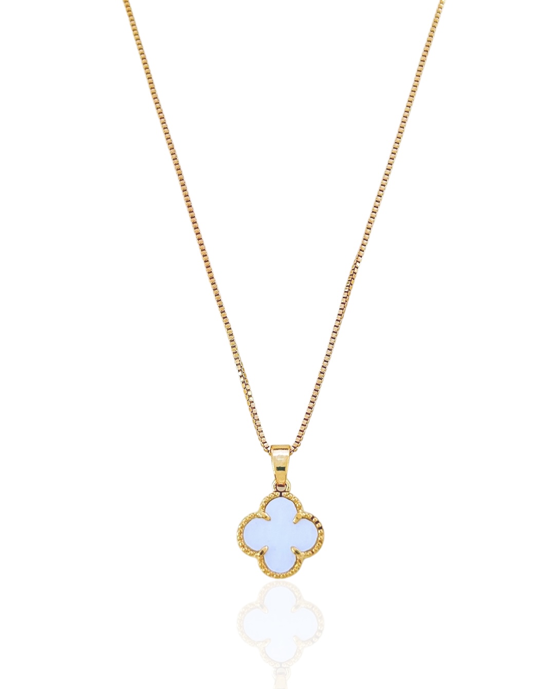 Colar Veneziana Trevo Resina Branca Perolada 40cm - Banho Ouro 18k