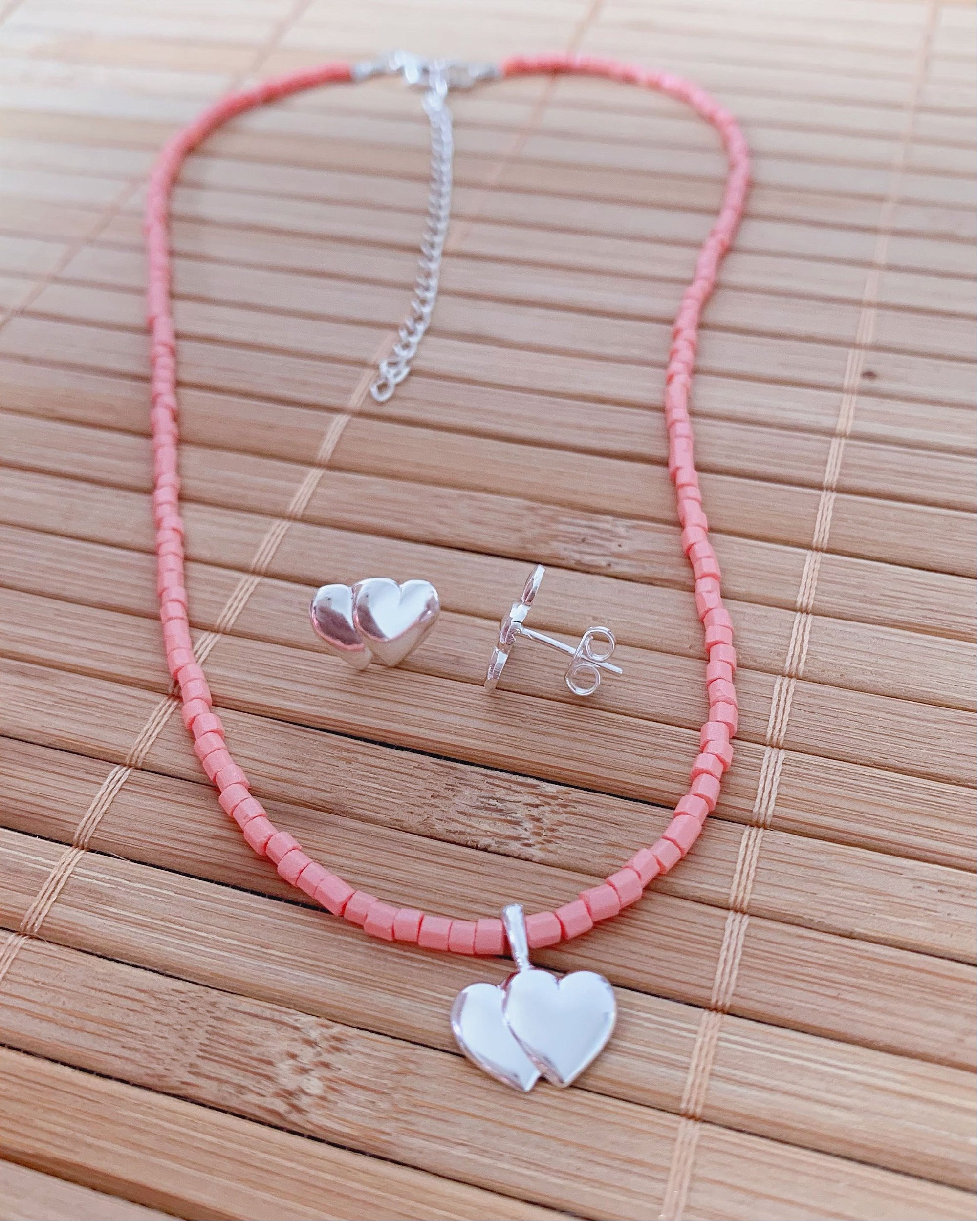 Conjunto Chocker Miçanga + Brinco de Prata Coração Duplo