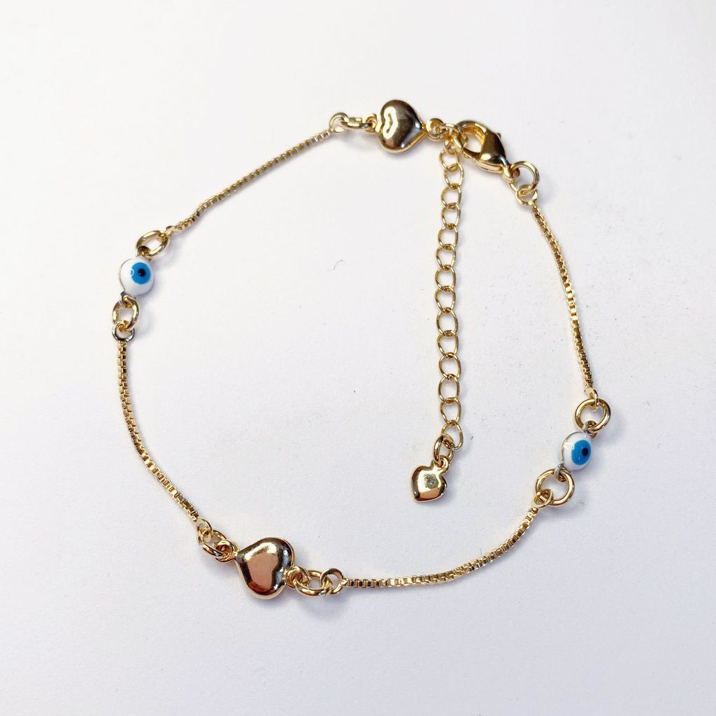 Pulseira Banhado a Ouro Olho Grego + Coração 22cm