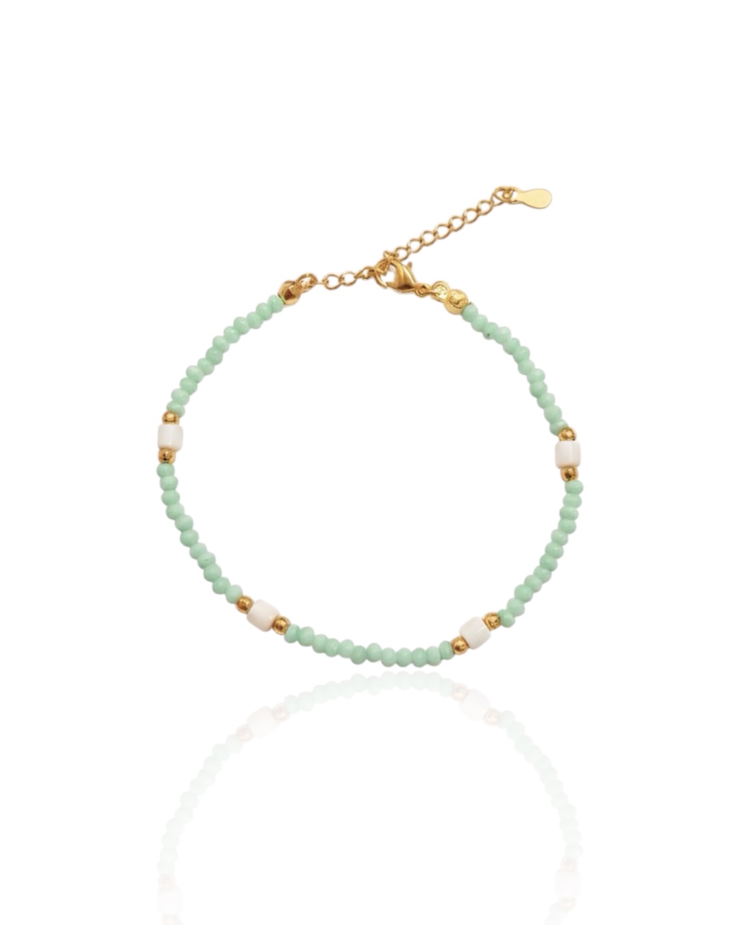 Comprimento: 18cm + 4cm de Extensor Medida Cristal: 3mm Fecho: Lagosta Material: Metal Banhado a Ouro 18k e Madrepérola Cor: Dourado, Verde Claro
