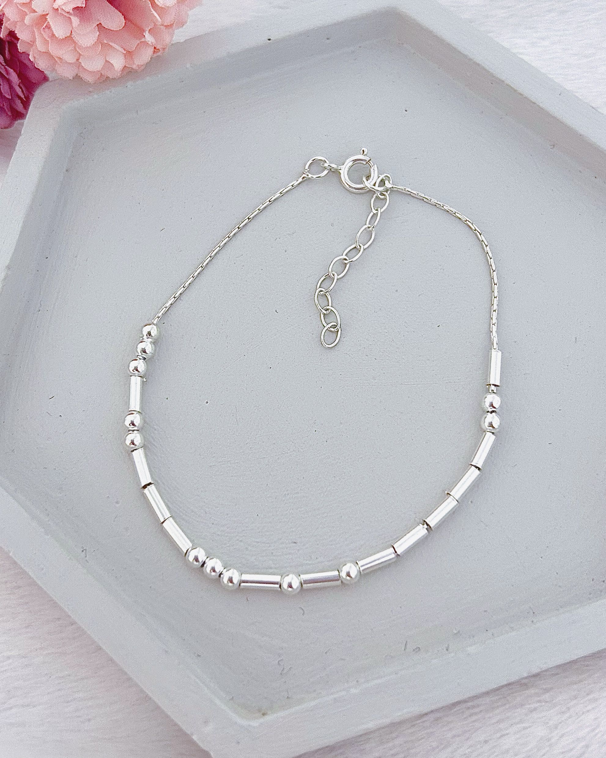 Pulseira de Prata Bolinhas e Canutilhos Fio Cardano 18cm + 3cm extensor