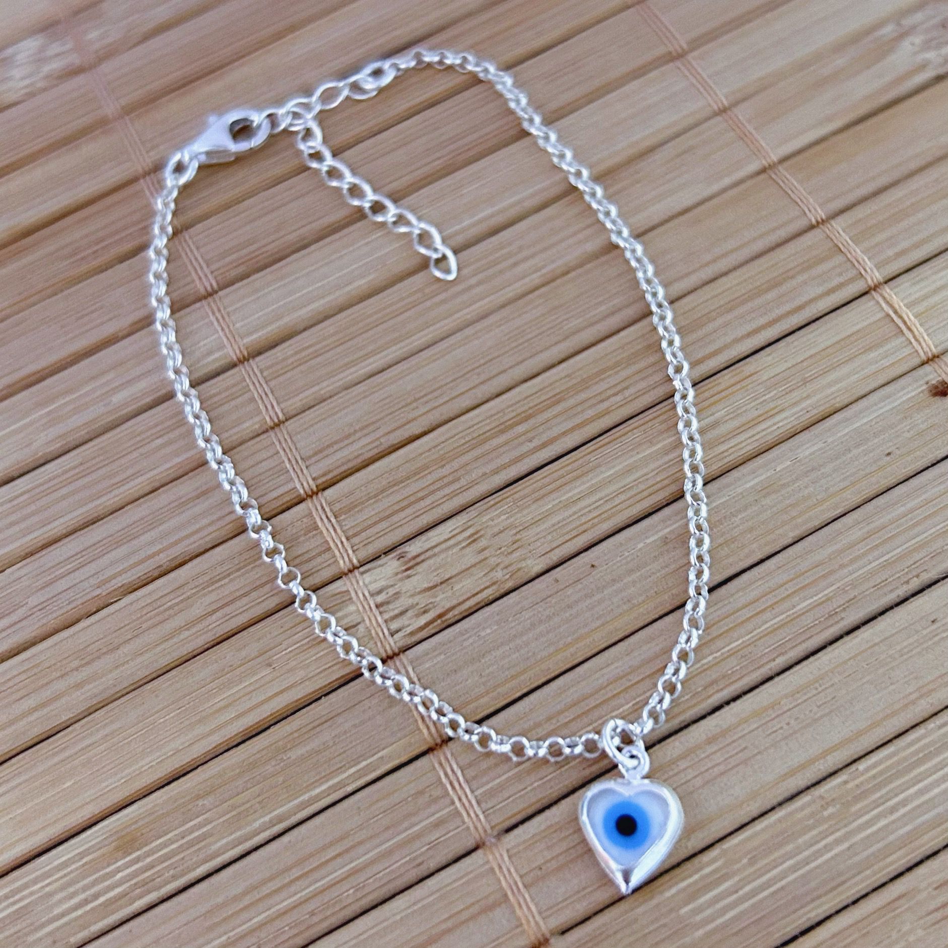 Pulseira de Prata Elo Português Olho Grego Coração 22cm