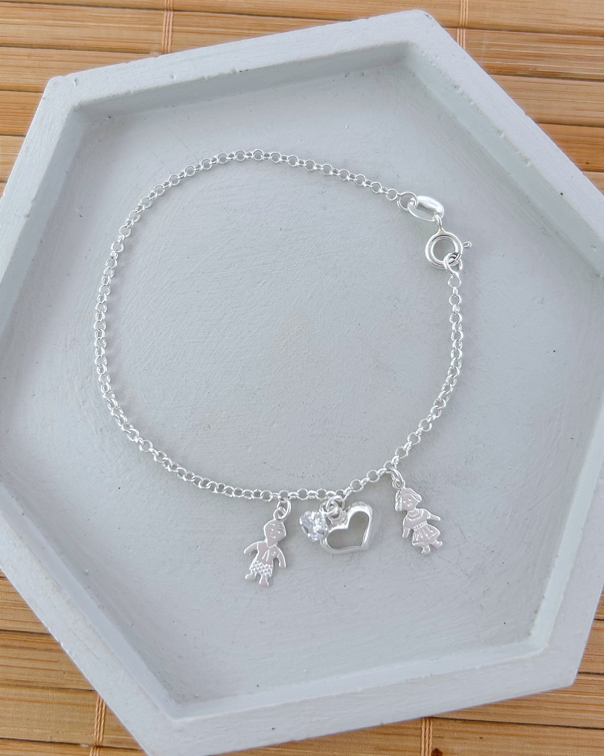 Pulseira em Prata 925 Filhos, Elo Português com 1 Pingente de Menino e 1 de Menina, 1 coração Vazado e 1 ponto de Luz Zircônia Cristal com Fecho Boia.