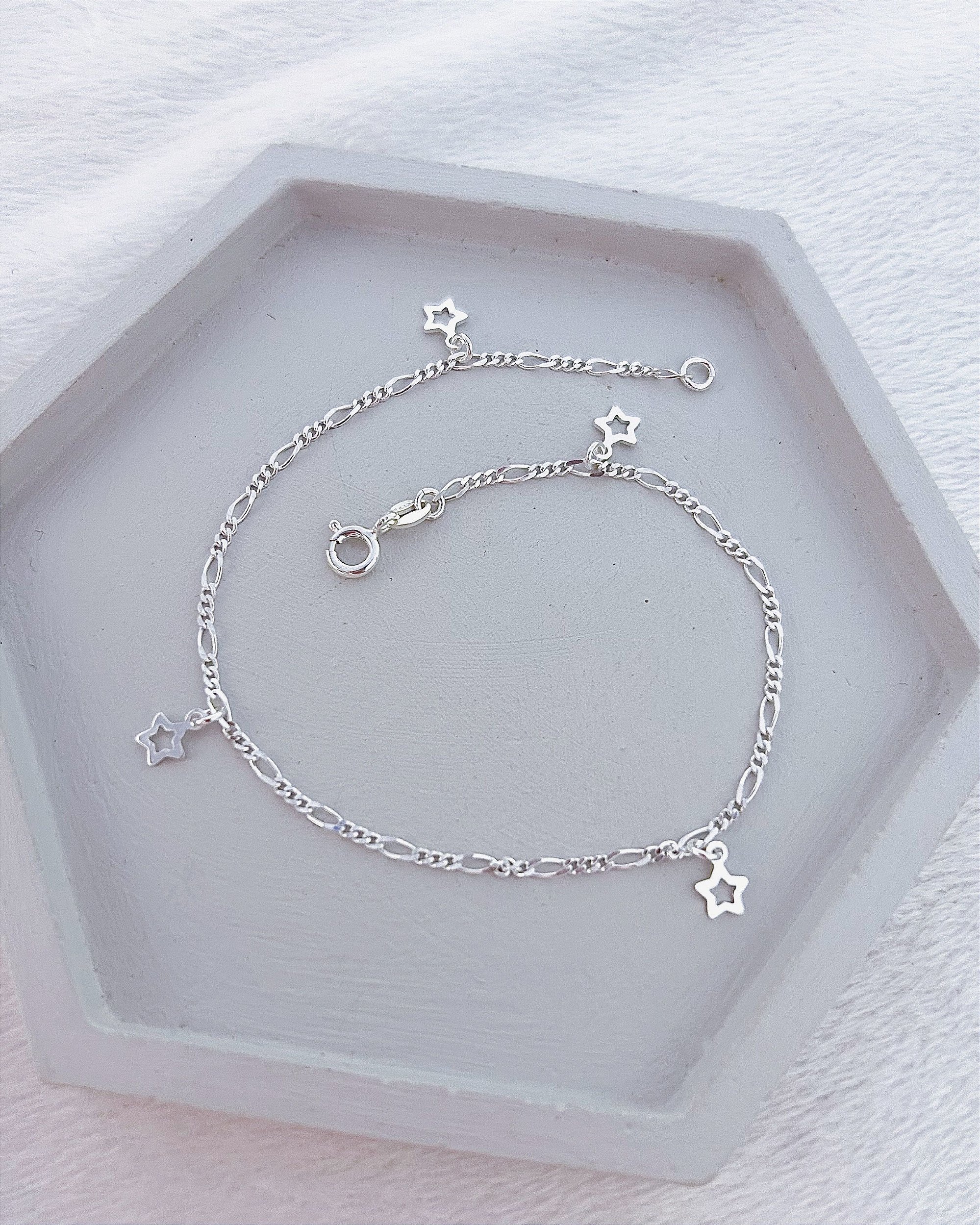 Tornozeleira de Prata 3x1 c/ 4 Estrelas Vazadas 22,5cm