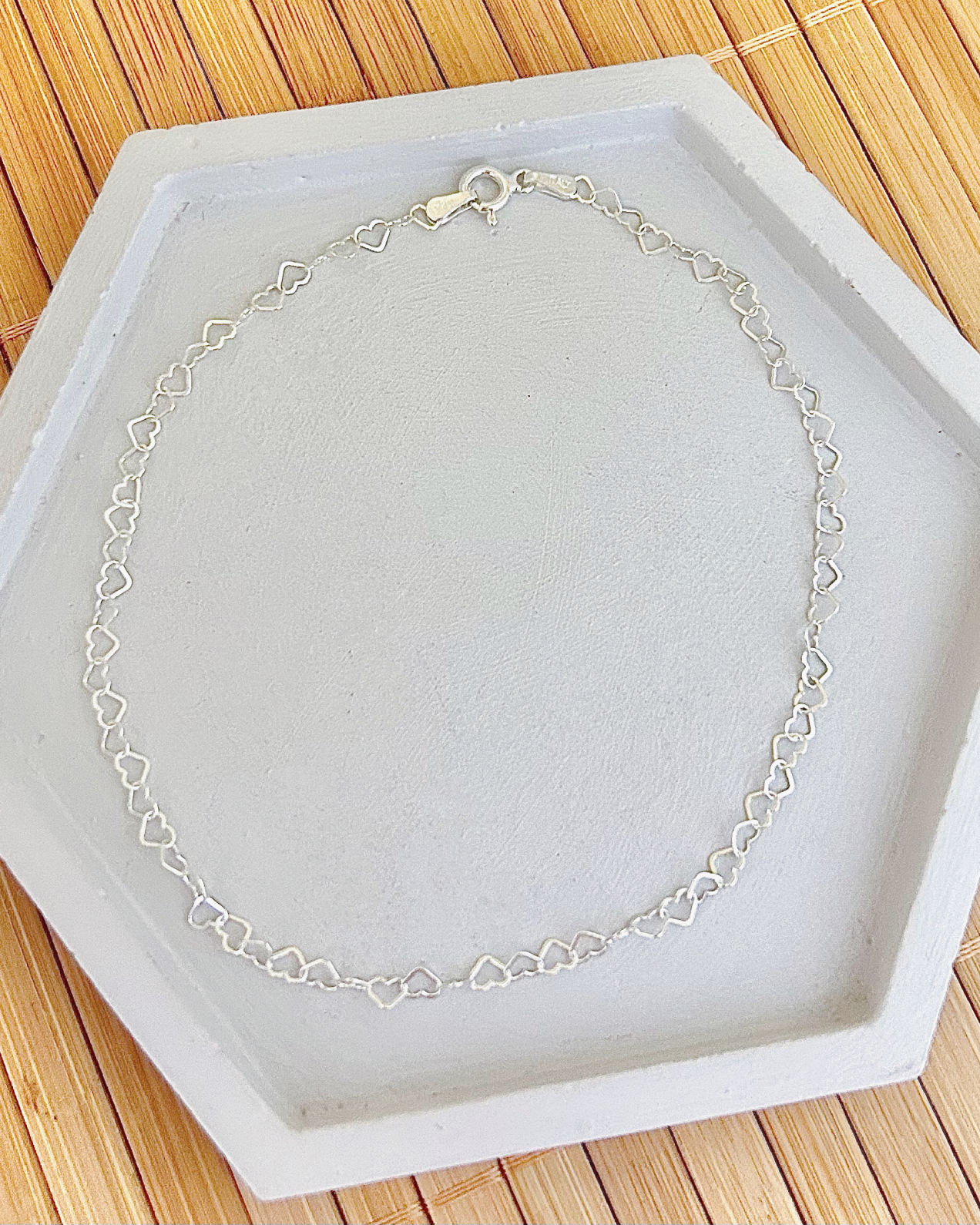 Tornozeleira em Prata 925 Elos Coração Vazados com Fecho Mola.